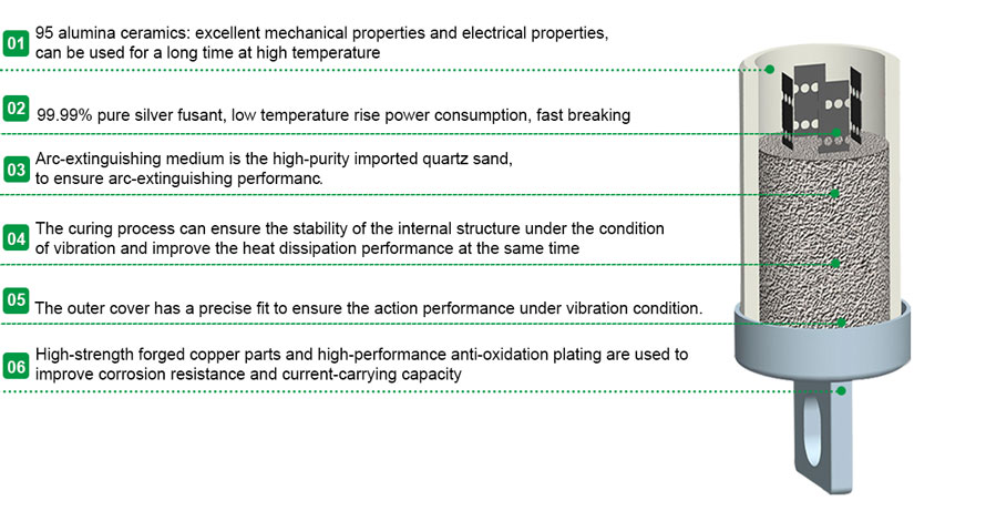 • Procédé de fabrication : Assemblage par rivetage du cuivre après soudage. Le sable de quartz interne est traité par solidification afin d'empêcher les produits de se détacher dans des conditions de travail dynamiques et d'éviter les projections d'arcs électriques causées par des défauts de ligne.