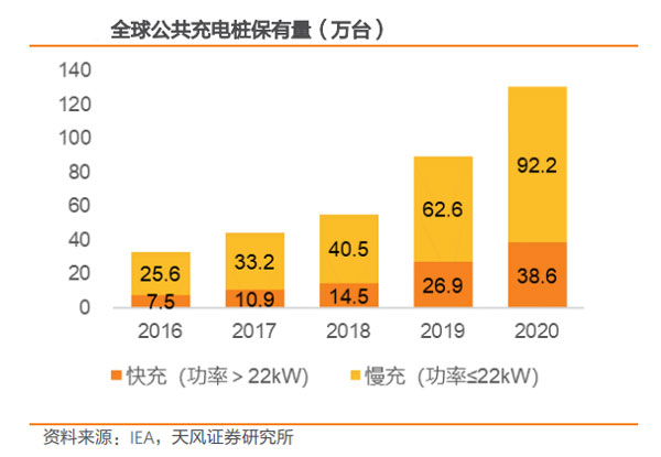 Le parc mondial de bornes de recharge publiques pour véhicules électriques atteindra 1,308 million d'unités en 2020. Selon les données de l'AIE, ce parc a connu une croissance rapide ces dernières années, avec 386 000 bornes de recharge rapide (puissance > 22 kW) et 922 000 bornes de recharge lente (puissance ≤ 22 kW) en 2020. On estime le ratio bornes de recharge publiques/véhicules à environ 11:1. La Chine disposera de 807 000 bornes de recharge publiques en 2020, se classant ainsi première au monde, les bornes de recharge rapide y représentant une part importante. En Europe, on compte 286 000 bornes de recharge publiques, dont 66 700 aux Pays-Bas, 44 700 en Allemagne et 33 500 au Royaume-Uni.