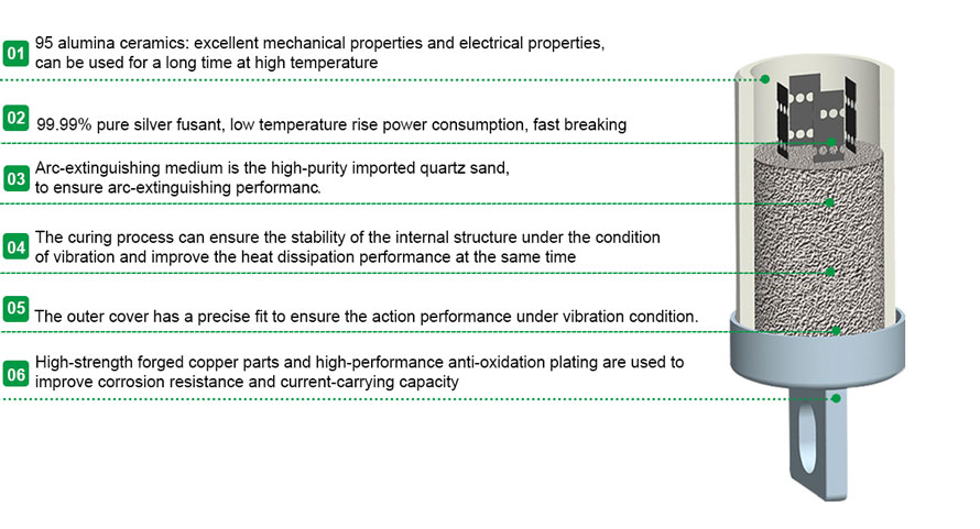 • Procédé de fabrication : Assemblage par rivetage du cuivre après soudage. Le sable de quartz interne est traité par solidification pour empêcher les produits de se détacher dans des conditions de travail dynamiques et pour éviter les projections d'arcs électriques causées par des défauts de ligne.